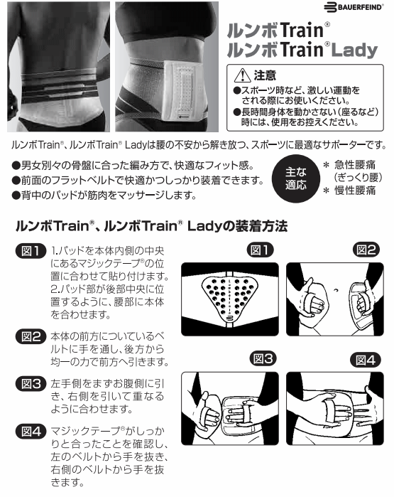 ■商品名 バウアーファインド(BAUERFEIND) 腰サポーター ルンボTrain Lady ■カラー チタン ■サイズ 腰骨の一番上の位置の周径 1:腰の周径70-80cm 2:腰の周径80-90cm 3:腰の周径90-100cm 4:腰の周径100-110cm 5:腰の周径110-120cm 6:腰の周径120-130cm ■備考 女性用 腰の安定と動作のサポート! ●男女別々の骨盤に合った編み方で、快適なフィット感 ●前面のフラットベルトで快適かつしっかり装着できます ●背中のパッドが筋肉をマッサージします 【適応症例】 ●急性腰痛症(ぎっくり腰) ●慢性腰痛症 ●骨軟骨炎、脊椎炎バウアーファインド(BAUERFEIND) 腰サポーター 腰を快適にサポート! ルンボTrain Lady 腰の安定と動作のサポート! ●男女別々の骨盤に合った編み方で、快適なフィット感 ●前面のフラットベルトで快適かつしっかり装着できます ●背中のパッドが筋肉をマッサージします 【適応症例】 ●上腕骨内外側上顆炎(例:テニスエルボー、ゴルフ肘) ●術後と外傷後の炎症 ●変形性関節症/関節炎 【使用上の注意点】 ・スポーツ時など、激しい運動をされる際にお使いください。