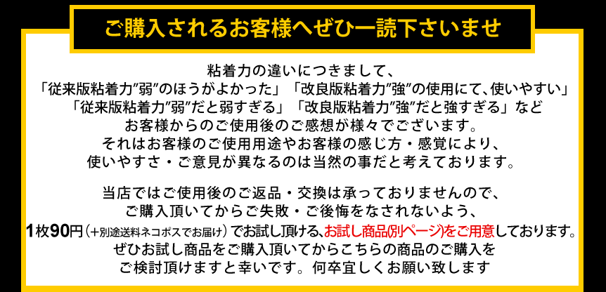 【※当店からのお願い※】粘着力の違いにつきまして、「従来版粘着力”弱”のほうがよかった」「改良版粘着力”強”の使用にて、使いやすい」「従来版粘着力”弱”だと弱すぎる」「改良版粘着力”強”だと強すぎる」などお客様からのご使用後のご感想が様々でございます。